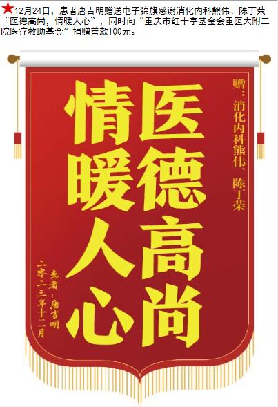 患者唐吉明赠送电子锦旗感谢消化内科熊伟等人,并向医疗救助基金捐赠善款100元。-锦旗-患者心声-患者服务-重庆医科大学附属第三医院【官方网站】