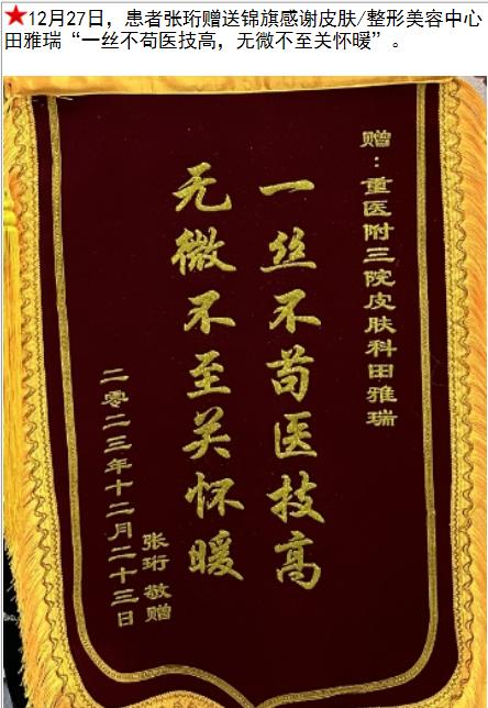 患者张珩赠送锦旗感谢皮肤/整形美容中心田雅瑞。-锦旗-患者心声-患者服务-重庆医科大学附属第三医院【官方网站】