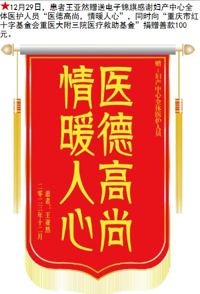 患者王亚然赠送电子锦旗感谢妇产中心全体医护人员,并向医疗救助基金捐赠善款100元。-锦旗-患者心声-患者服务-重庆医科大学附属第三医院【官方网站】
