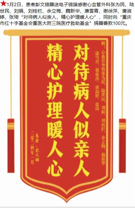 患者彭文锦赠送电子锦旗感谢心血管外科张为民等人,并向医疗救助基金捐赠善款100元。-锦旗-患者心声-患者服务-重庆医科大学附属第三医院【官方网站】