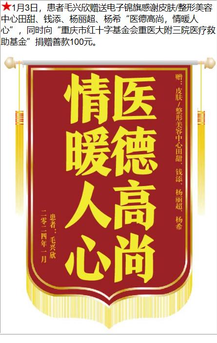 患者毛兴欣赠送电子锦旗感谢皮肤/整形美容中心田甜等人,并向医疗救助基金捐赠善款100元。-锦旗-患者心声-患者服务-重庆医科大学附属第三医院【官方网站】