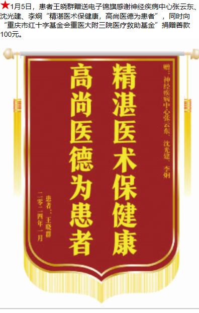 患者王晓群赠送电子锦旗感谢神经疾病中心张云东等人,并向医疗救助基金捐赠善款100元。-锦旗-患者心声-患者服务-重庆医科大学附属第三医院【官方网站】