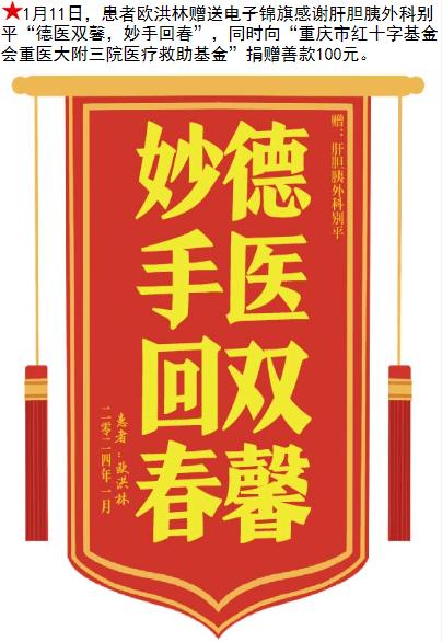 患者欧洪林赠送电子锦旗感谢肝胆胰外科别平,并向医疗救助基金捐赠善款100元。-锦旗-患者心声-患者服务-重庆医科大学附属第三医院【官方网站】