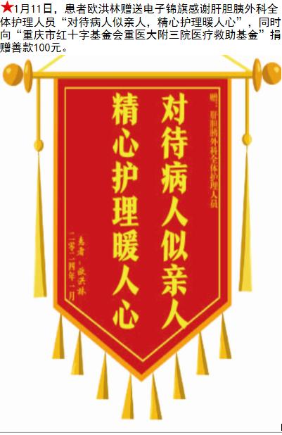 患者欧洪林赠送电子锦旗感谢肝胆胰外科全体护理人员,并向医疗救助基金捐赠善款100元。-锦旗-患者心声-患者服务-重庆医科大学附属第三医院【官方网站】