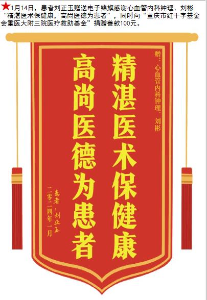 患者刘正玉赠送电子锦旗感谢心血管内科钟理等人,并向医疗救助基金捐赠善款100元。-锦旗-患者心声-患者服务-重庆医科大学附属第三医院【官方网站】