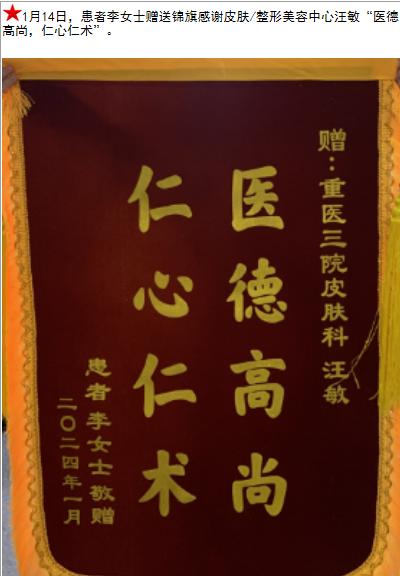患者李女士赠送锦旗感谢皮肤/整形美容中心汪敏。-锦旗-患者心声-患者服务-重庆医科大学附属第三医院【官方网站】