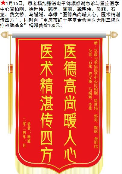 患者杨旭赠送电子锦旗感谢急诊与重症医学中心闫柏刚等人,并向医疗救助基金捐赠善款100元。-锦旗-患者心声-患者服务-重庆医科大学附属第三医院【官方网站】
