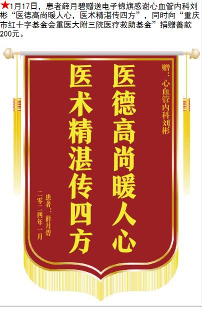 患者薛月碧赠送电子锦旗感谢心血管内科刘彬,并向医疗救助基金捐赠善款200元。-锦旗-患者心声-患者服务-重庆医科大学附属第三医院【官方网站】