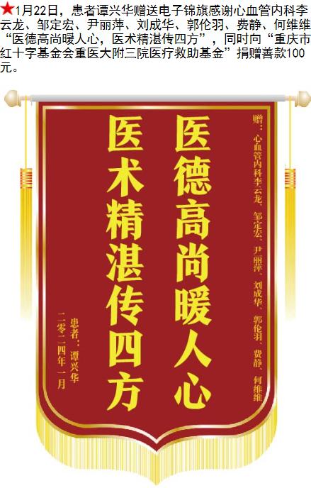 患者谭兴华赠送电子锦旗感谢心血管内科李云龙等人,并向医疗救助基金捐赠善款100元。-锦旗-患者心声-患者服务-重庆医科大学附属第三医院【官方网站】