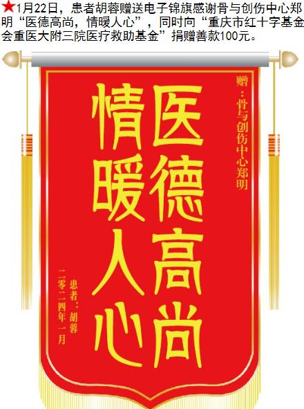 患者胡蓉赠送电子锦旗感谢骨与创伤中心郑明,并向医疗救助基金捐赠善款100元。-锦旗-患者心声-患者服务-重庆医科大学附属第三医院【官方网站】