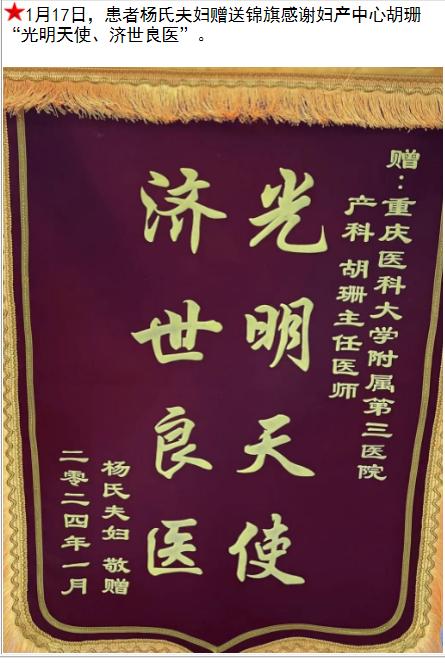 患者杨氏夫妇赠送锦旗感谢妇产中心胡珊。-锦旗-患者心声-患者服务-重庆医科大学附属第三医院【官方网站】