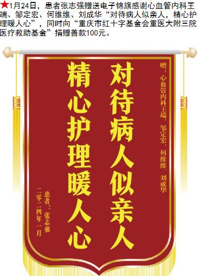 患者张志强赠送电子锦旗感谢心血管内科王端等人,并向医疗救助基金捐赠善款100元。-锦旗-患者心声-患者服务-重庆医科大学附属第三医院【官方网站】