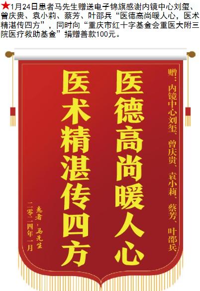 患者马先生赠送电子锦旗感谢内镜中心刘玺等人,并向医疗救助基金捐赠善款100元。-锦旗-患者心声-患者服务-重庆医科大学附属第三医院【官方网站】