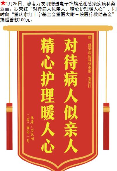 患者万友明赠送电子锦旗感谢感染疾病科蔡亚丽等人,并向医疗救助基金捐赠善款100元。-锦旗-患者心声-患者服务-重庆医科大学附属第三医院【官方网站】