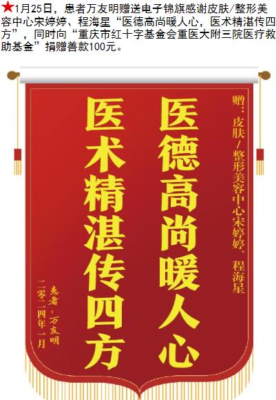 患者万友明赠送电子锦旗感谢皮肤/整形美容中心宋婷婷等人,并向医疗救助基金捐赠善款100元。-锦旗-患者心声-患者服务-重庆医科大学附属第三医院【官方网站】