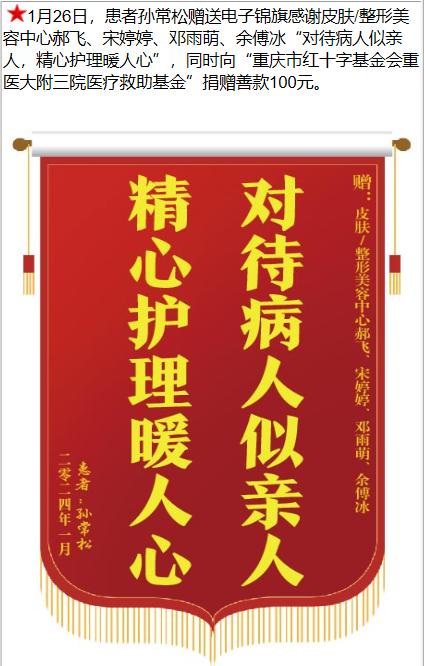 患者孙常松赠送电子锦旗感谢皮肤/整形美容中心郝飞等人,并向医疗救助基金捐赠善款100元。-锦旗-患者心声-患者服务-重庆医科大学附属第三医院【官方网站】