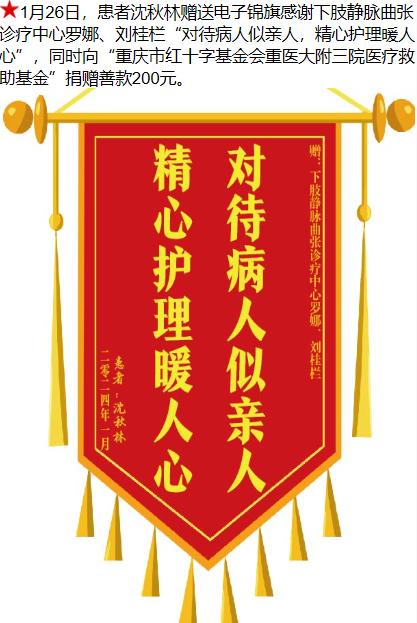 患者沈秋林赠送电子锦旗感谢下肢静脉曲张诊疗中心罗娜等人,并向医疗救助基金捐赠善款200元。-锦旗-患者心声-患者服务-重庆医科大学附属第三医院【官方网站】