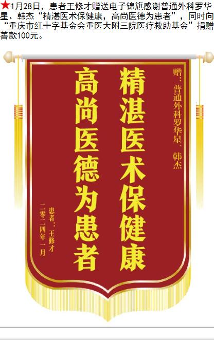 患者王修才赠送电子锦旗感谢普通外科罗华星等人,并向医疗救助基金捐赠善款100元。-锦旗-患者心声-患者服务-重庆医科大学附属第三医院【官方网站】