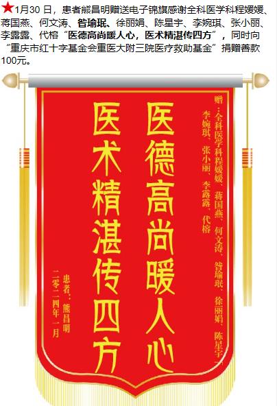 患者熊昌明赠送电子锦旗感谢全科医学科程媛媛等人,并向医疗救助基金捐赠善款100元。-锦旗-患者心声-患者服务-重庆医科大学附属第三医院【官方网站】