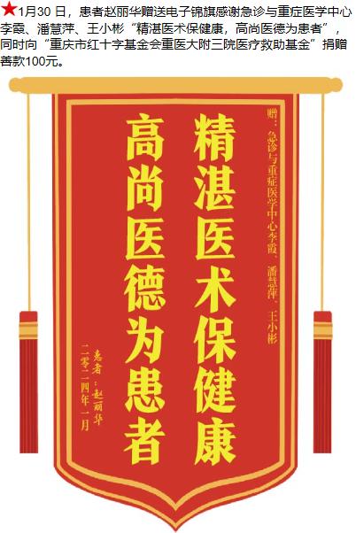 患者赵丽华赠送电子锦旗感谢急诊与重症医学中心李霞等人,并向医疗救助基金捐赠善款100元。-锦旗-患者心声-患者服务-重庆医科大学附属第三医院【官方网站】