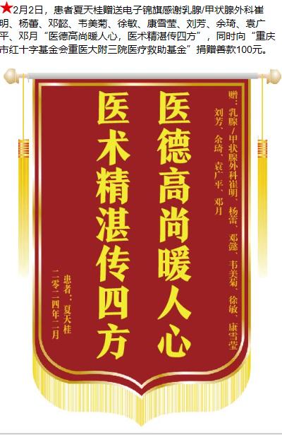 患者夏天桂赠送电子锦旗感谢乳腺/甲状腺外科崔明等人,并向医疗救助基金捐赠善款100元。-锦旗-患者心声-患者服务-重庆医科大学附属第三医院【官方网站】