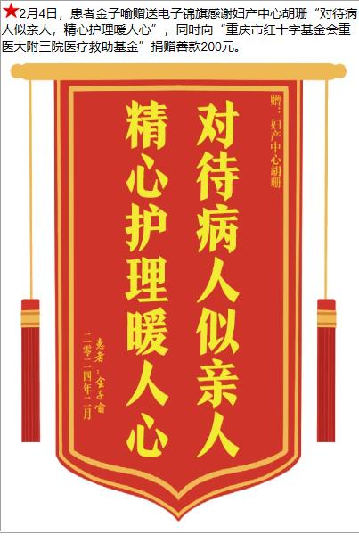 患者金子喻赠送电子锦旗感谢妇产中心胡珊,并向医疗救助基金捐赠善款100元。-锦旗-患者心声-患者服务-重庆医科大学附属第三医院【官方网站】