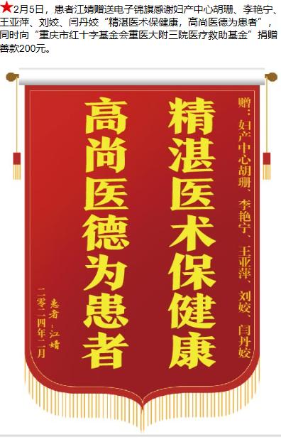 患者江婧赠送电子锦旗感谢妇产中心胡珊等人,并向医疗救助基金捐赠善款100元。-锦旗-患者心声-患者服务-重庆医科大学附属第三医院【官方网站】