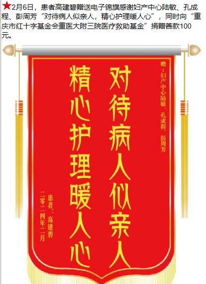 患者高建碧赠送电子锦旗感谢妇产中心陆敏,并向医疗救助基金捐赠善款100元。-锦旗-患者心声-患者服务-重庆医科大学附属第三医院【官方网站】