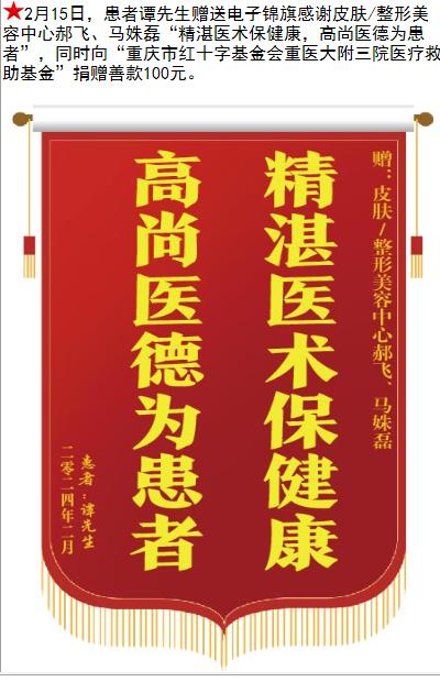 患者谭先生赠送电子锦旗感谢皮肤/整形美容中心郝飞等人,并向医疗救助基金捐赠善款100元。-锦旗-患者心声-患者服务-重庆医科大学附属第三医院【官方网站】