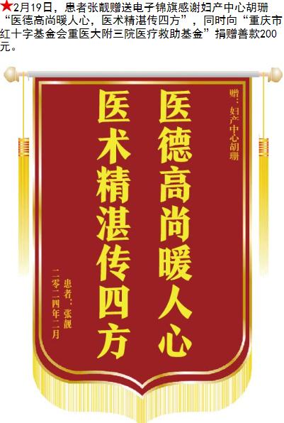 患者张靓赠送电子锦旗感谢妇产中心胡珊,并向医疗救助基金捐赠善款200元。-锦旗-患者心声-患者服务-重庆医科大学附属第三医院【官方网站】