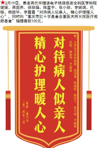 患者蒋代华赠送电子锦旗感谢全科医学科程媛媛等人,并向医疗救助基金捐赠善款100元。-锦旗-患者心声-患者服务-重庆医科大学附属第三医院【官方网站】