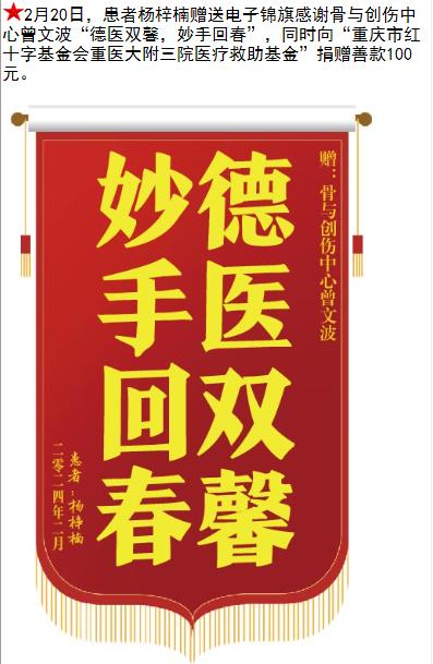 患者杨梓楠赠送电子锦旗感谢骨与创伤中心曾文波,并向医疗救助基金捐赠善款100元。-锦旗-患者心声-患者服务-重庆医科大学附属第三医院【官方网站】