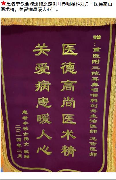 患者李铁金赠送锦旗感谢耳鼻咽喉科刘舟。-锦旗-患者心声-患者服务-重庆医科大学附属第三医院【官方网站】