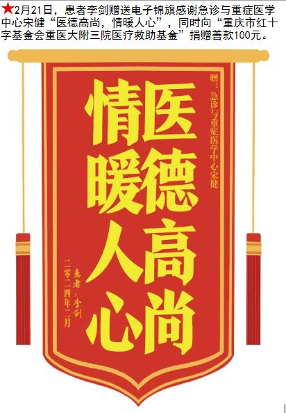 患者李剑赠送电子锦旗感谢急诊与重症医学中心宋健,并向医疗救助基金捐赠善款100元。-锦旗-患者心声-患者服务-重庆医科大学附属第三医院【官方网站】