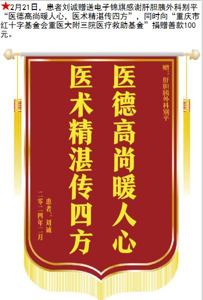 患者刘诚赠送电子锦旗感谢肝胆胰外科别平,并向医疗救助基金捐赠善款100元。-锦旗-患者心声-患者服务-重庆医科大学附属第三医院【官方网站】