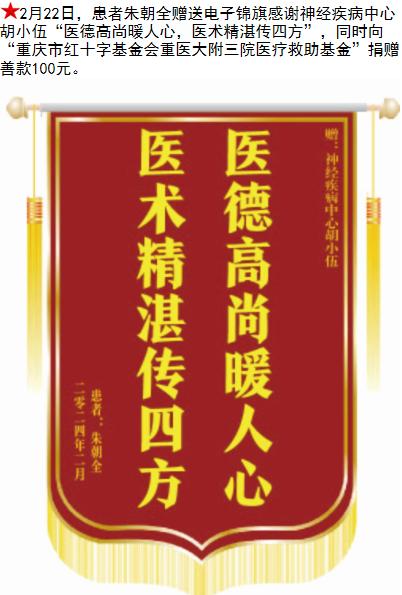 患者朱朝全赠送电子锦旗感谢神经疾病中心胡小伍,并向医疗救助基金捐赠善款100元。-锦旗-患者心声-患者服务-重庆医科大学附属第三医院【官方网站】