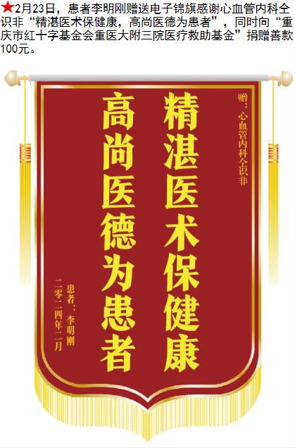 患者李明刚赠送点电子锦旗感谢心血管内科仝识非,并向医疗救助基金捐赠善款100元。-锦旗-患者心声-患者服务-重庆医科大学附属第三医院【官方网站】
