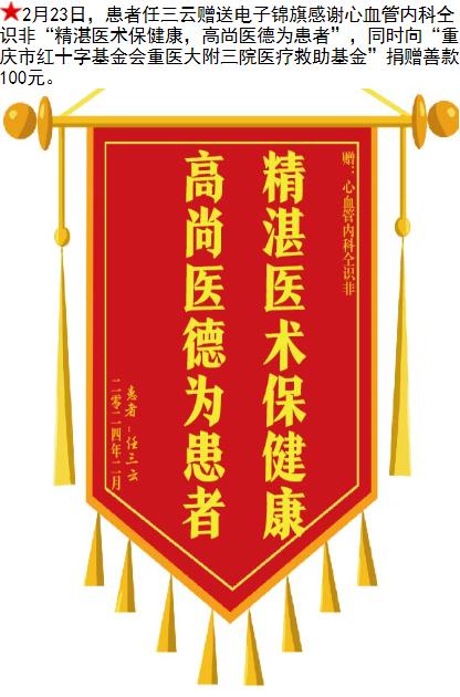 患者任三云赠送电子锦旗感谢心血管内科仝识非,并向医疗救助基金捐赠善款100元。-锦旗-患者心声-患者服务-重庆医科大学附属第三医院【官方网站】