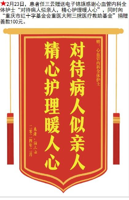 患者任三云赠送电子锦旗感谢心血管内科全体护理人员,并向医疗救助基金捐赠善款100元。-锦旗-患者心声-患者服务-重庆医科大学附属第三医院【官方网站】