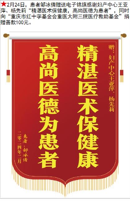 患者邹冰倩赠送电子锦旗感谢妇产中心王亚萍,并向医疗救助基金捐赠善款100元。-锦旗-患者心声-患者服务-重庆医科大学附属第三医院【官方网站】