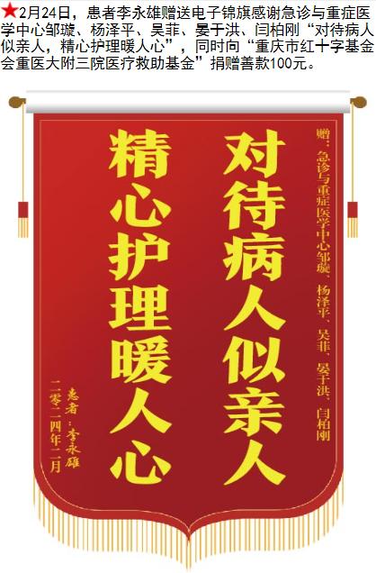 患者李永雄赠送电子锦旗感谢急诊与重症医学中心邹璇等人,并向医疗救助基金捐赠善款100元。-锦旗-患者心声-患者服务-重庆医科大学附属第三医院【官方网站】