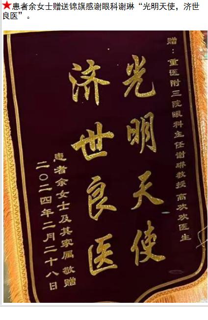 患者余女士赠送锦旗感谢眼科谢琳“光明天使,济世良医”。-锦旗-患者心声-患者服务-重庆医科大学附属第三医院【官方网站】