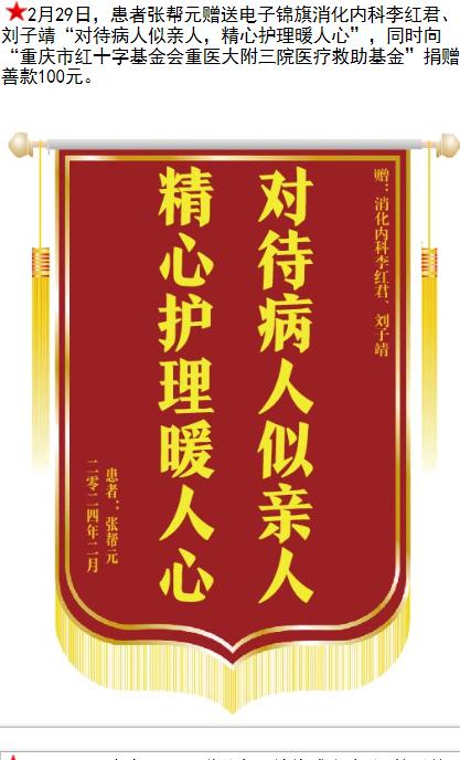 患者张帮元赠送电子锦旗感谢消化内科李红君等人,并向医疗救助基金捐赠善款100元。-锦旗-患者心声-患者服务-重庆医科大学附属第三医院【官方网站】