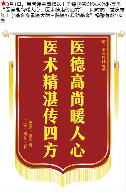 患者谭兰菊赠送电子锦旗感谢泌尿外科贾民,并向医疗救助基金捐赠善款100元。-锦旗-患者心声-患者服务-重庆医科大学附属第三医院【官方网站】