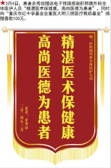 患者余秀琼赠送电子锦旗感谢肝胆胰外科全体医护人员,并向医疗救助基金捐赠善款100元。-锦旗-患者心声-患者服务-重庆医科大学附属第三医院【官方网站】
