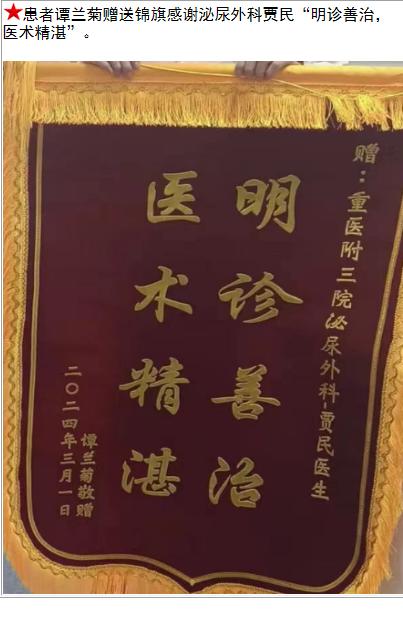 患者谭兰菊赠送锦旗感谢泌尿外科贾民。-锦旗-患者心声-患者服务-重庆医科大学附属第三医院【官方网站】