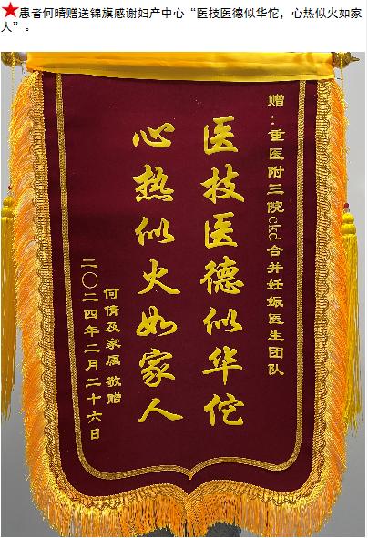 患者何晴赠送锦旗感谢妇产中心。-锦旗-患者心声-患者服务-重庆医科大学附属第三医院【官方网站】