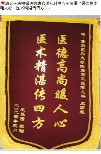 患者王辰橙赠送锦旗感谢儿科中心王丽雁。-锦旗-患者心声-患者服务-重庆医科大学附属第三医院【官方网站】