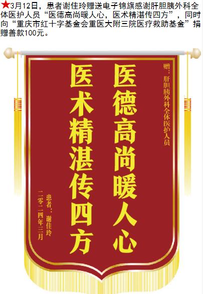 患者谢佳玲赠送电子锦旗感谢肝胆胰外科全体医护人员,并向医疗救助基金捐赠善款100元。-锦旗-患者心声-患者服务-重庆医科大学附属第三医院【官方网站】