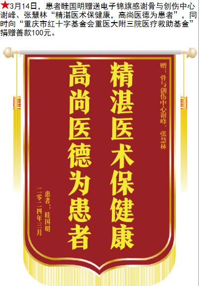 患者睦国明赠送电子锦旗感谢骨与创伤中心谢峰等人,并向医疗救助基金捐赠善款100元。-锦旗-患者心声-患者服务-重庆医科大学附属第三医院【官方网站】
